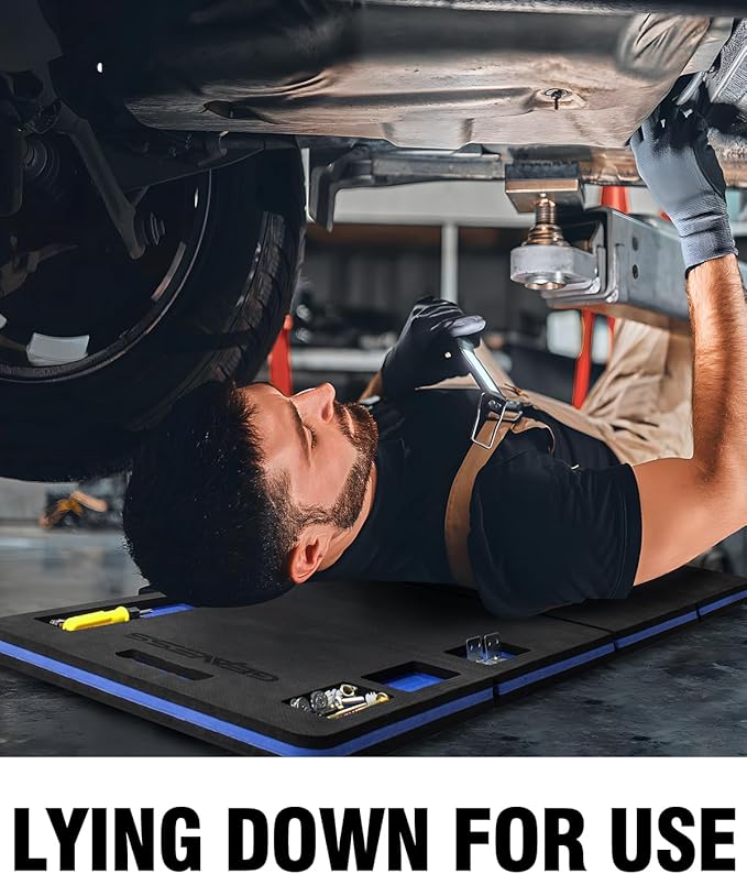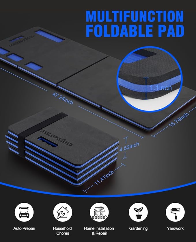1.1" Extra Thick Foldable Garden Kneeling Pad with Handle & Belt & Tool Compartments – EVA Foam Knee Cushion Mat for Gardening, Mechanic Work, Auto Repair (47.2" x 15.7" x 1.1", Black & Blue)
