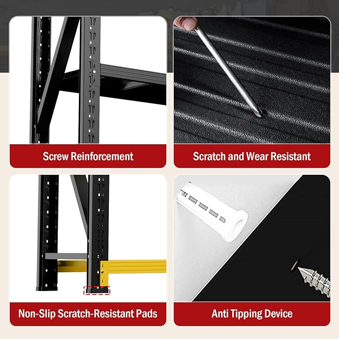 - 【Heavy Duty Garage Shelves with Multiple Protective Features】Our storage shelves heavy duty is made entirely of metal and treated with a special process to ensure a smooth surface that will not deform over time. The metal storage rack is also equipped with anti-tip devices and anti-slip pads to effectively protect your valuable items. In addition to garage storage, metal shelving can also be used in basements, stores, outdoors, and homes, making it the best choice for your storage needs