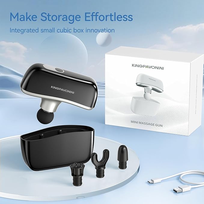 - [Pocket-Sized & Featherlight] Smaller than your phone (4.9" tall) and lighter than your morning coffee (0.5lbs), KingPavonini muscle massage gun slips effortlessly into crossbody bags or jacket pockets; easy to hold and carry, the ergonomic grip fits your hands, delivering comfortable massage without wrist strain