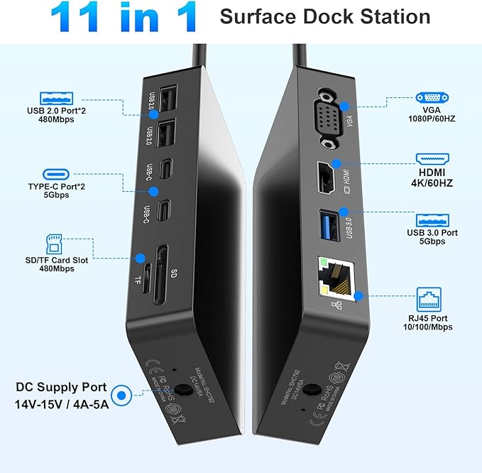 - 💻【11-IN-1 Surface Docking Station】The Microsoft Surface Dock instantly turns your Surface device into a desktop PC using advanced surface connection technology, offering versatile functionality for all your needs. This 11-in-1 dual monitor display dock for Microsoft Surface Pro includes 4K@60Hz HDMI ports, 1080P@60Hz VGA port, Gigabit RJ45 port, 2 USB-C data ports, USB 3.0 ports, 2 * USB 2.0 ports, SD/TF micro SD card slot, and a 72W DC power supply. Simplify your setup. Boost your workflow.