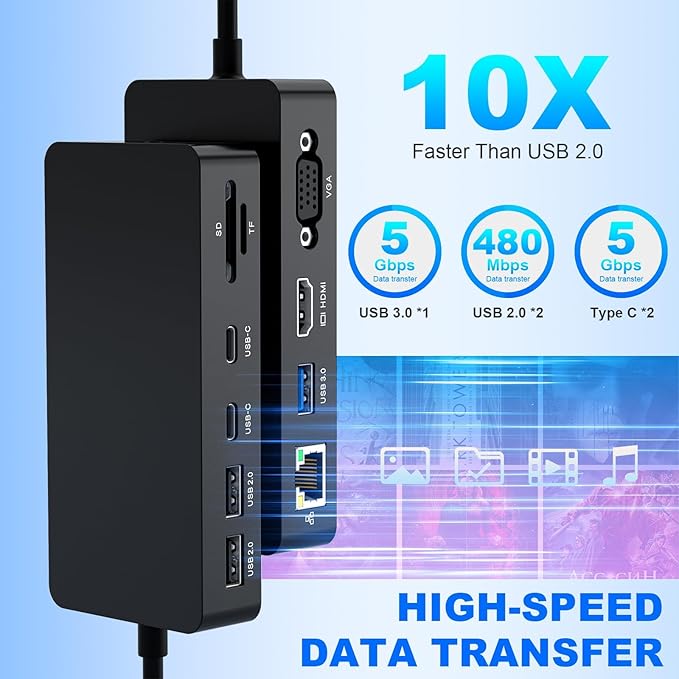 - ⚡【Ultra-High Speed Data Transfer & Memory Card Reader】Our Surface Pro hub multiport adapter features USB 3.0 and 2 USB-C ports for lightning-fast data transfer up to 5Gbps, allowing you to transfer photos or videos to your Microsoft surface laptop in seconds. Microsoft Surface laptop docking station also includes 2 USB 2.0 ports and a TF/SD card reader with data transfer speeds up to 480Mbps. Perfect for connecting USB peripherals like flash drives, hard drives, keyboards, mice, printers, and more.