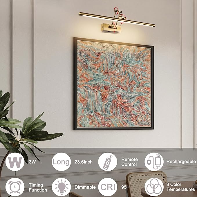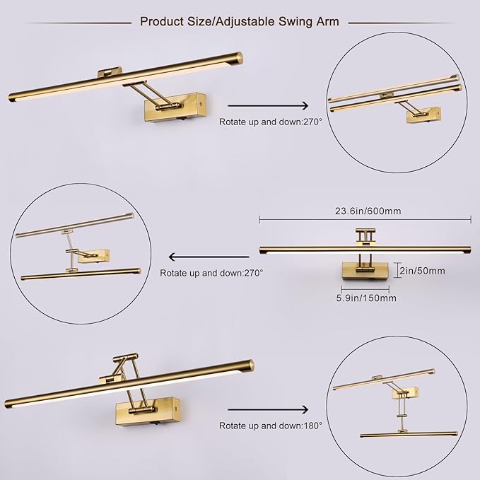 - Rotations& Wide Applications: The painting lights cordless with 180°rotation swing arm and 270°rotatable lamphead, you can rotate the direction of the light source according to your needs. The battery operated wall light is widely used in picture, art, gallery. The bar picture light for wall is also suitable for your indoor home decor