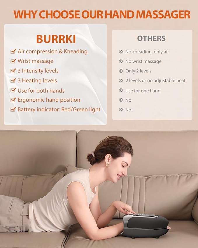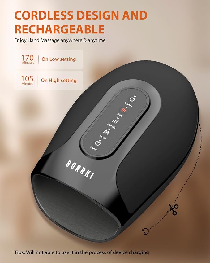 - Fully Customizable Massage Experience: Burrki hand massager offers 3 massage modes, 2 shiatsu kneading levels, 3 intensity levels, and 3 heating levels, allows you to customize your massage experience to suit your comfort preferences. It is recommended to start with the lowest setting for the first time using