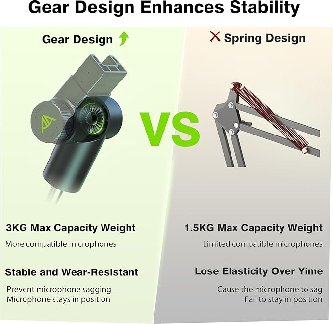 - [Gear Locking for No-Droop Stability] Unlike spring-loaded mic boom arms that can weaken and sag over time, our microphone arm uses a precision gear locking mechanism to hold your mic exactly where you want it. It offers long-term stability without losing tension, even after years of use.