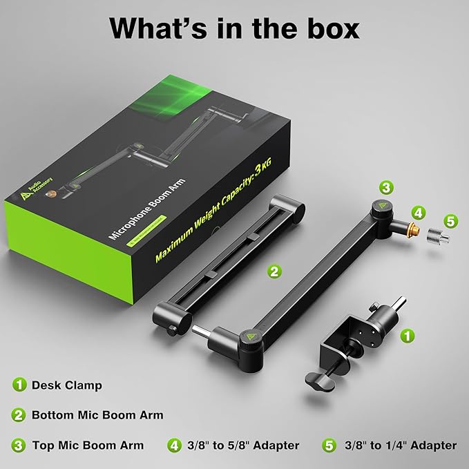 - [Universal Mic Compatibility, Especially Heavy Mics] This low profile mic arm has 6.6lbs max load capacity and is compatible with a wide range of popular microphones, including Shure SM7B, SM7dB, MV7, MV7+, MV7X, RODE PodMic, AT2020, AT2035, FIFINE AM8, K669B, HyperX QuadCast, SoloCast, Snowball iCE, Elgato Wave, and more. Equipped with 1/4", 3/8" and 5/8" adapters, this mic boom arm connects seamlessly to most mic mounts.