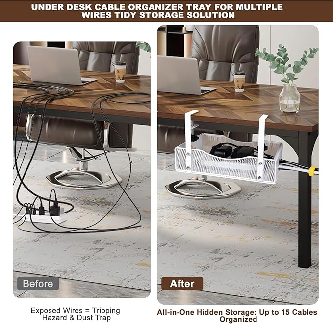 - Versatile & Multi-Device Compatibility : The Extra Wide Under Desk Cable Management Tray fits 99% of desks with its adjustable tension clamps, ensuring no slipping even on tilted standing desks. This versatile solution is ideal for home offices, gaming setups, and Coworking spaces, effectively organizing up to 15+ cables, including USB hubs, monitor wires, and smart home devices.