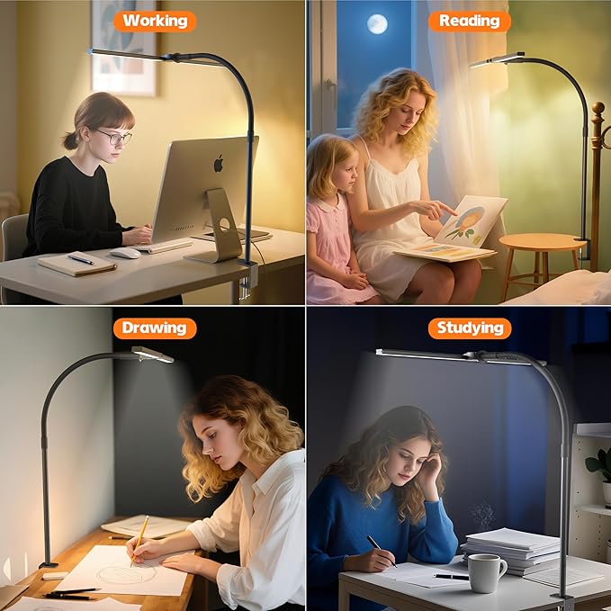 - Dimmable Stepless Lighting: The desk lamp is designed to fully meet diverse needs, featuring 5 color temperature adjustments (3000K-6500K) and brightness settings (10%-100%). It allows for personalized lighting based on individual preferences, different scenarios, moods, and task requirements. Additionally, the smart desk light memory function automatically restores the last-used settings.