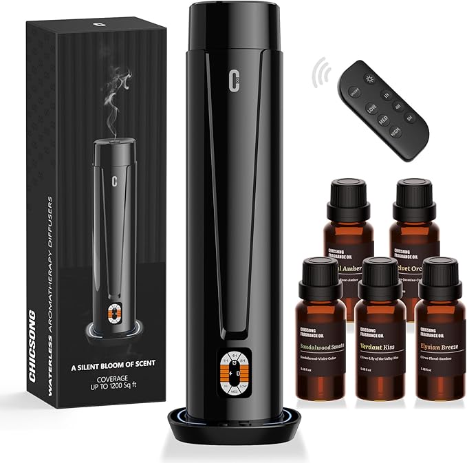 - 【Waterless Scent Diffuser】Chicsong aromatherapy diffuser utilizes advanced cold-air diffusion technology to transform pure essential oils into ultra-fine, dry mist—without any water or heat. It preserves the natural integrity of the oils and delivers a longer-lasting, more consistent scent experience.