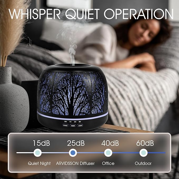- Elevate your environment with ARVIDSSON ultrasonic essential oil diffuser, designed to enhance your home's ambiance. Featuring a 500ml capacity, it offers extended misting for up to 12 hours, making it perfect for bedrooms, living rooms, or offices.