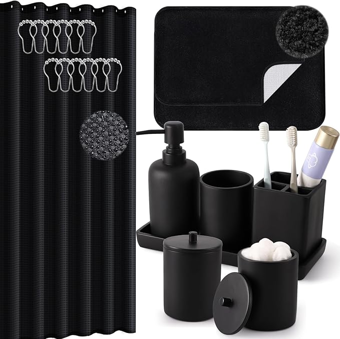 21 Pcs Bathroom Accessory Set with Waterproof Shower Curtain and Non Slip Mat,Resin Bath Set with Toothbrush Holder and Lotion Soap Dispenser,Bathroom Countertop Organizer Set for Home Apartment