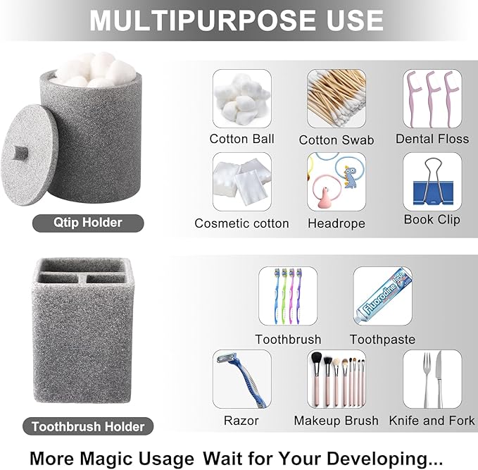 - High Quality Resin Material -6-piece resin bathroom accessory set is easy to clean, with a smooth surface that can be wiped with a towel or rinsed with water. Waterproof design can prolong the service life of products when stored in humid environments for a long time.