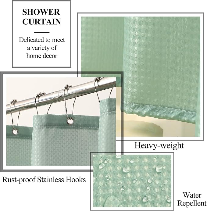 - Solid Color Waterproof Shower Curtain - This shower curtain size is designed for most showers or bathtubs and is made of high-quality polyester fabric to keep the bathroom dry. The 12 stainless steel hooks used in conjunction with the shower curtain slide smoothly and are easy to install.