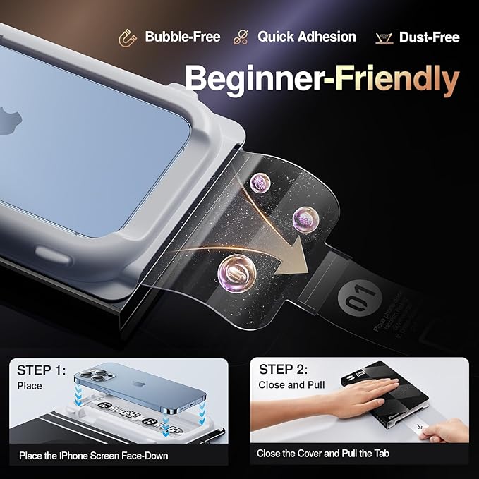 - Effortless Installation:Equipped with an auto dust-elimination tool that delivers a fast, accurate, and bubble-free application, keeping your screen perfectly clear with minimal effort.