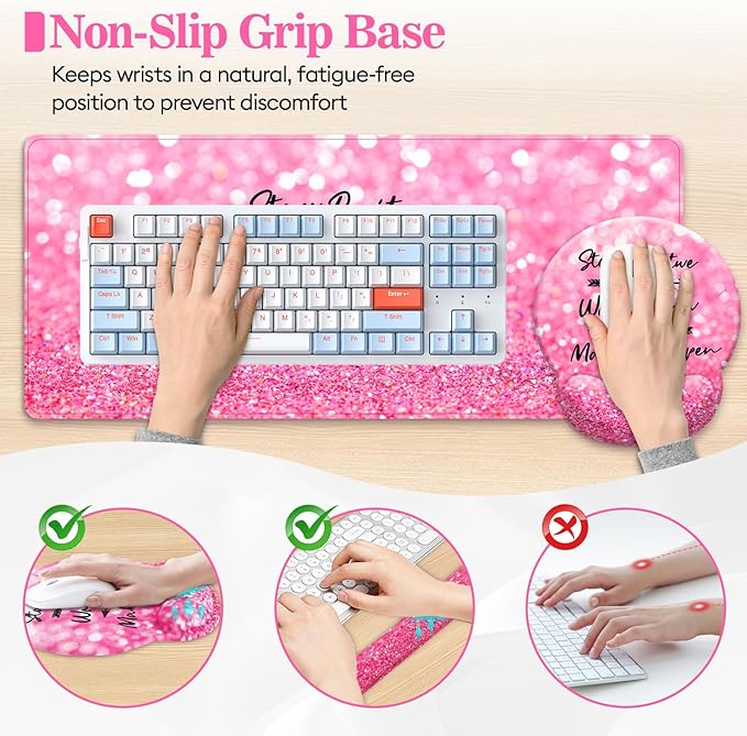 - Premium Workspace Coverage: Large mouse pad 35.4x15.7 and desk pad mat 17.32x3.15,computer mat 8.66x9.84 creates ultimate desk ecosystem.Keyboard pad with cloud wrist rest fits full sized keyboards.Pink desk accessories blend seamlessly with pink office supplies for cohesive workstation aesthetics