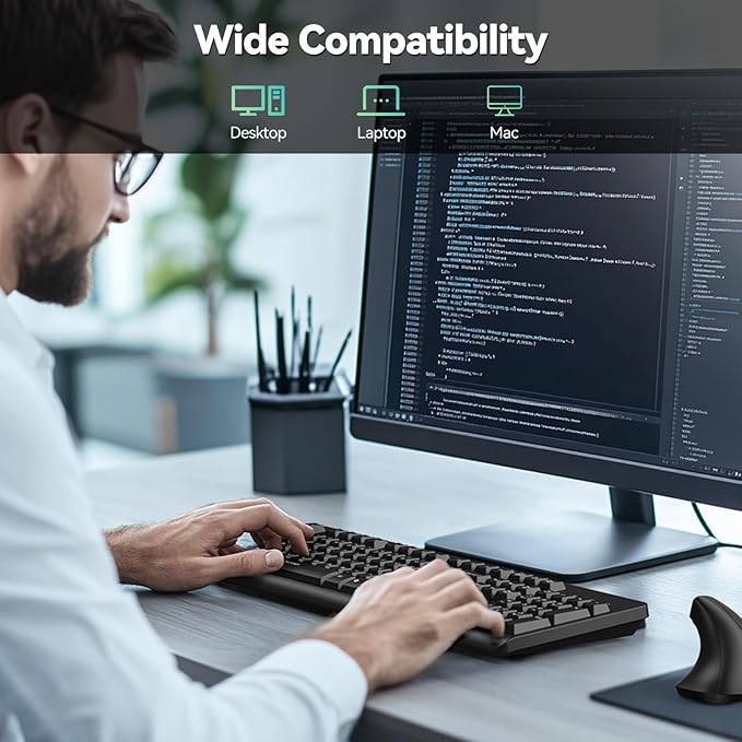 - 【 Ergonomic & Full-Size Keyboard】The ergonomic wireless keyboard features 8° foldable tilt feet and crater-shaped keycaps that match your finger shape. The full-size layout with number pad ensures comfortable typing for long working hours at home or in the office