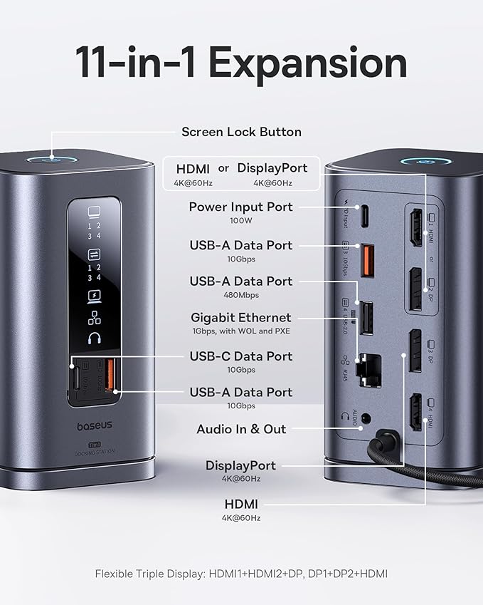 Baseus Laptop Docking Station, 11 in 1 Triple 4K Display HDMI/DP, 10Gbps USB A/C Fast Data, PD 100W, Ethernet, Audio, USB C Docking Station for Windows/Dell/HP/Lenovo/Asus/Acer/Mac (Include Charger)