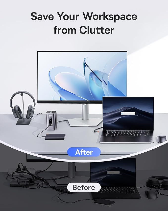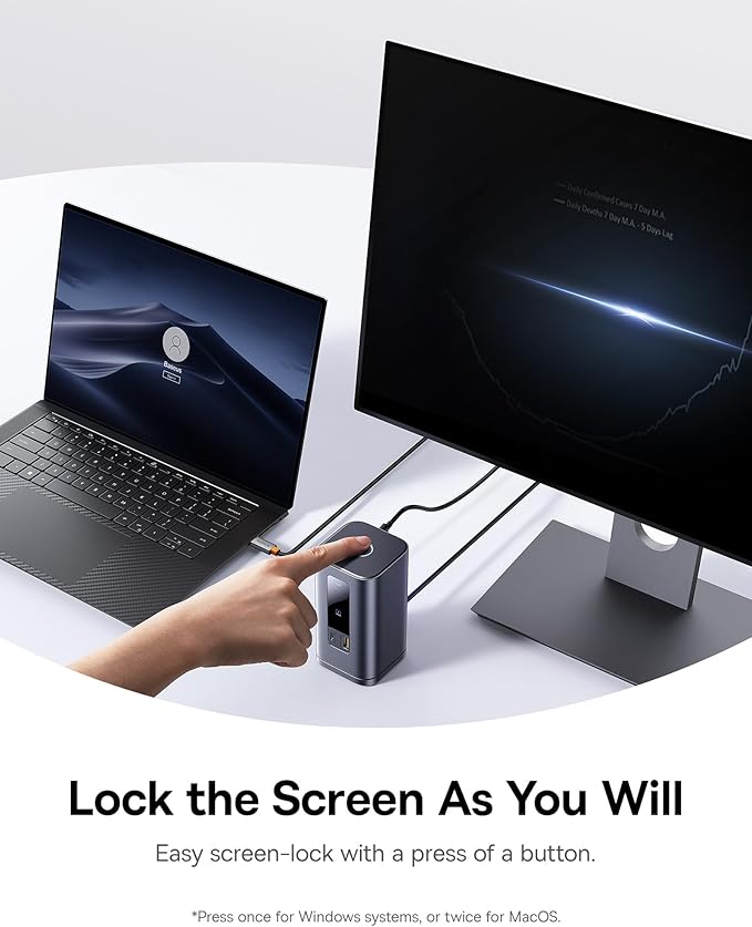 - Innovative Upright Design with Screen-Lock: Sleek aluminum finish, vertical stand with magnetic base, and an 80cm cable maximize desk space and convenience. The built-in LED screen shows port connection status, while the screen-lock button lets you instantly secure sensitive information with one touch.