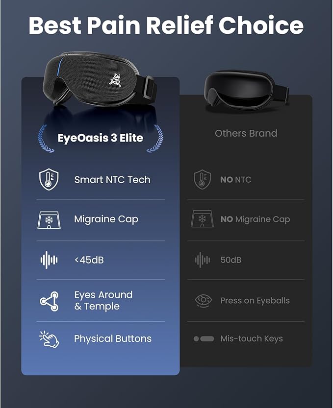 - Experience a Professional and Relaxing Eye Massage - Developed by famous US physical therapists Bob Schrupp and Brad Heineck, the EyeOasis 3 Elite smart eye massager with a cooling gel mask combines heat, cooling, compression, and gentle acupressure kneading massage to deliver exceptional relaxation and relief from eye strain, dry eyes, stress and headache pain. Notice: We do not recommend use of eye machines for customers who have undergone eye operation, retina condition, cataract, glaucoma, etc
