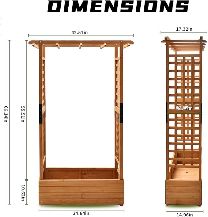 - 【Materials and Dimensions】Constructed from high-quality cedar wood, this raised garden bed with trellis is built to last. Hanging roof: 42.5” L x 17.3” W; Side trellis: 14.2” W x 55.5” H; Planter box: 34.6” L x 14.9” W x 10.6” H; Overall: 42.5" L x 17.3" W x 66.1" H.