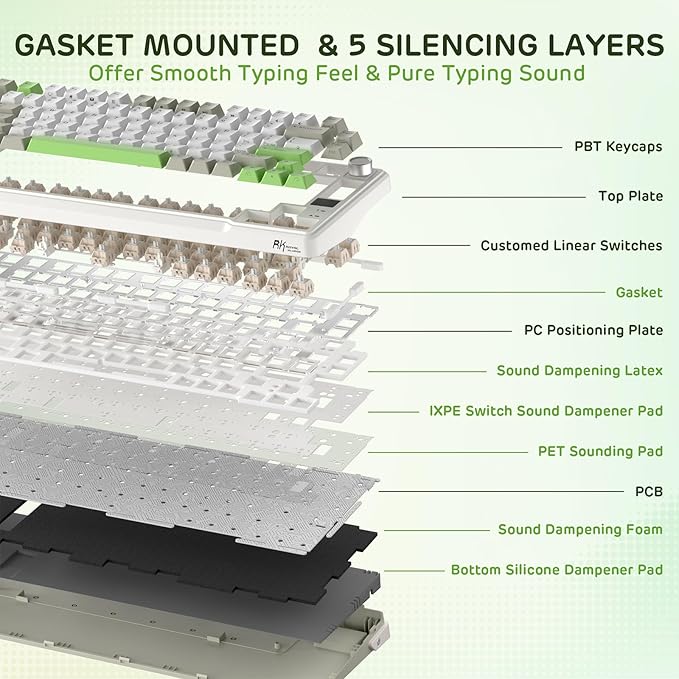 - Five Sound-Dampening Layer — With five layers of internal padding, including 2 layers of thick sound-absorbing foams, an IXPE switch pad, silicone dampener and PET sound-enhancement film, this keyboard structure significantly minimizes hollow sounds and cavity noise, delivering a super smooth and satisfying typing experience.