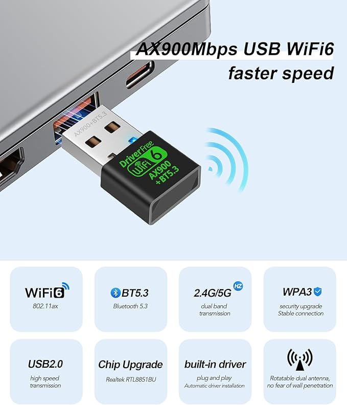USB WiFi 6 & Bluetooth 5.3 Adapter for Desktop PC,AX900Mbps Dual Band 5/2.4Ghz Wireless Network Adapter ,Built-in Driver for PC/Laptop/Desktop 4dBi Antenna Compatible with Windows 10/11