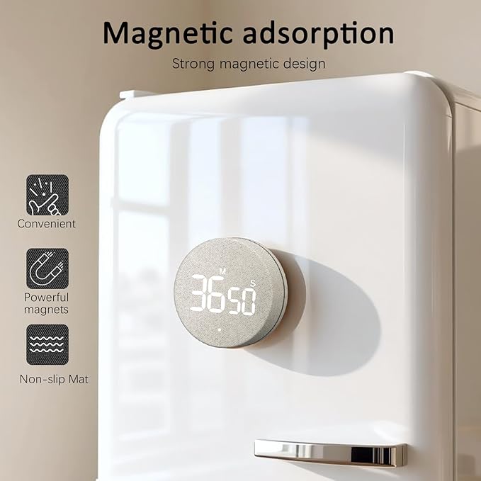 - 【Versatile Placement and Modern Aesthetics】: This timer is equipped with silent mode, treble, two modes and a strong magnetic back cover for secure mounting on a refrigerator, metal cabinet or table. Its minimalist digital timer display and rotating bezel provide a modern home time accessory for any decor.