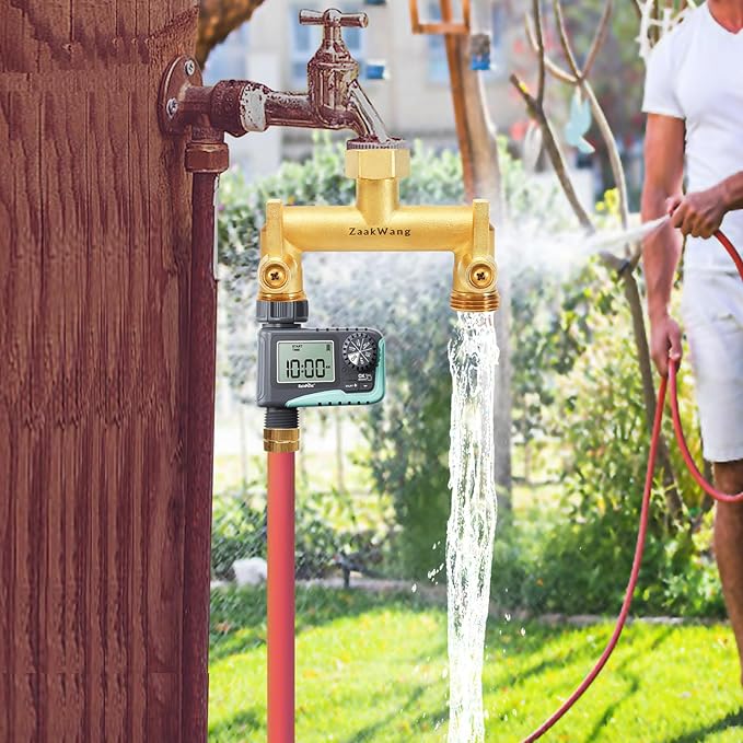 - DUAL OUTLET DESIGN: The 2 way hose splitter enables simultaneous connection of two hoses, maximizing efficiency for various watering tasks. Equipped with a metal shutoff valve and long handle, it allows for precise water flow regulation and convenient operation.