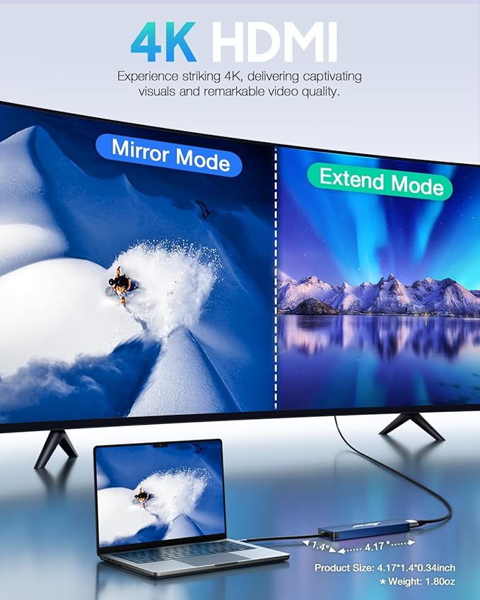 - 4K HDMI Display – Mirror or extend to monitors/TVs/projectors up to 3840×2160@30Hz (supports 1080p@60Hz). Requires a USB-C port with DisplayPort Alt Mode; not all phones/tablets support video out