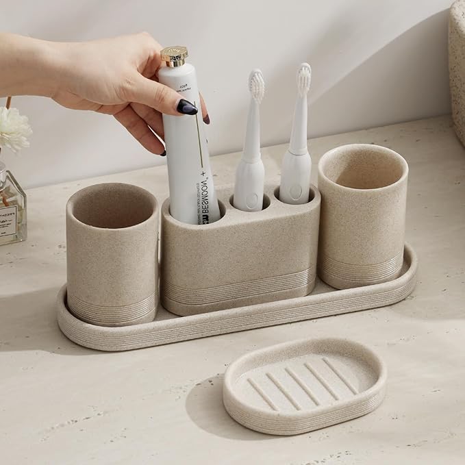 Bathroom Accessories Set, 4 pcs Toothbrush Holders Set Included 3 Slots Electric Toothbrush and Toothpaste Holder Stand, 2 Tumblers & Tray for Bathroom Countertop Sink Modern Decor (Beige)