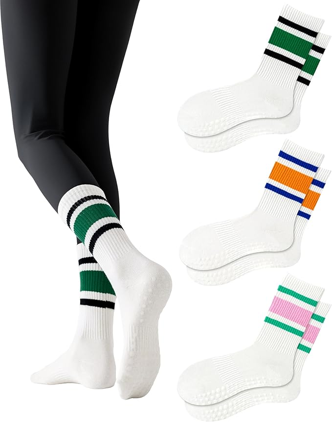 Yawlsow 3 Pairs Pilates Grip Socks for Women Yoga Grippy Striped Retro Crew Socks Non Slip Sticky Barre Sock with Grippers