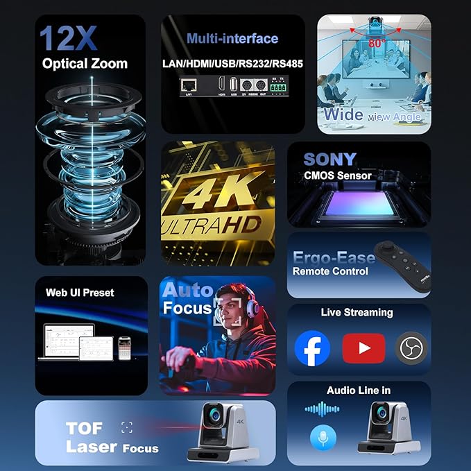 - True 4K30 Ultra HD Video with 12X Optical Zoom: This PTZ camera captures every detail in 4K Ultra HD at 30fps, delivering crystal-clear visuals for professional video conferencing, church, worship, streaming, and live events. The 12X optical zoom ensures sharp close-ups, making it ideal for large meeting rooms.