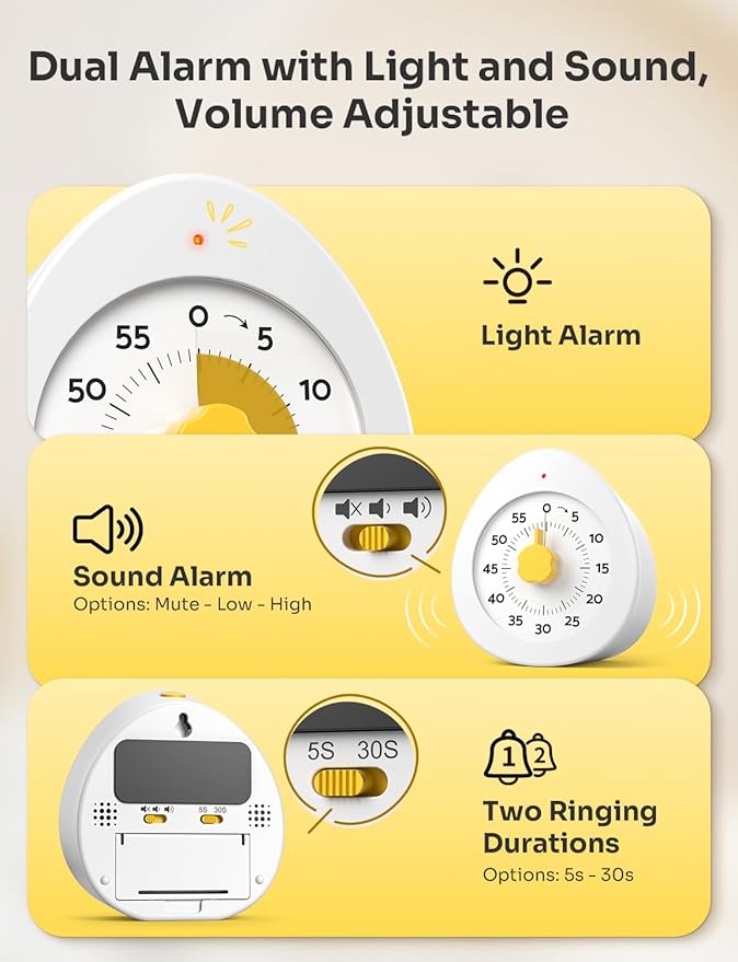 - [No Ticking & Adjustable Alarm] Thanks to the sophisticated internal structure, there is almost no sound from inside the timer while it is running, so you can concentrate on the job at hand without any distraction, the alarm will ring to remind you when the timer is over. The volume can be set to High/Low/Mute, the ringing time can be set to 5s/30s