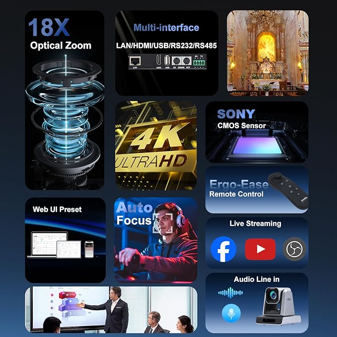 - True 4K30 Ultra HD Video with 18X Optical Zoom: This PTZ camera captures every detail in 4K Ultra HD at 30fps, delivering crystal-clear visuals for professional video conferencing, church, worship, streaming, and live events. The 18X optical zoom ensures sharp close-ups, making it ideal for large meeting rooms.