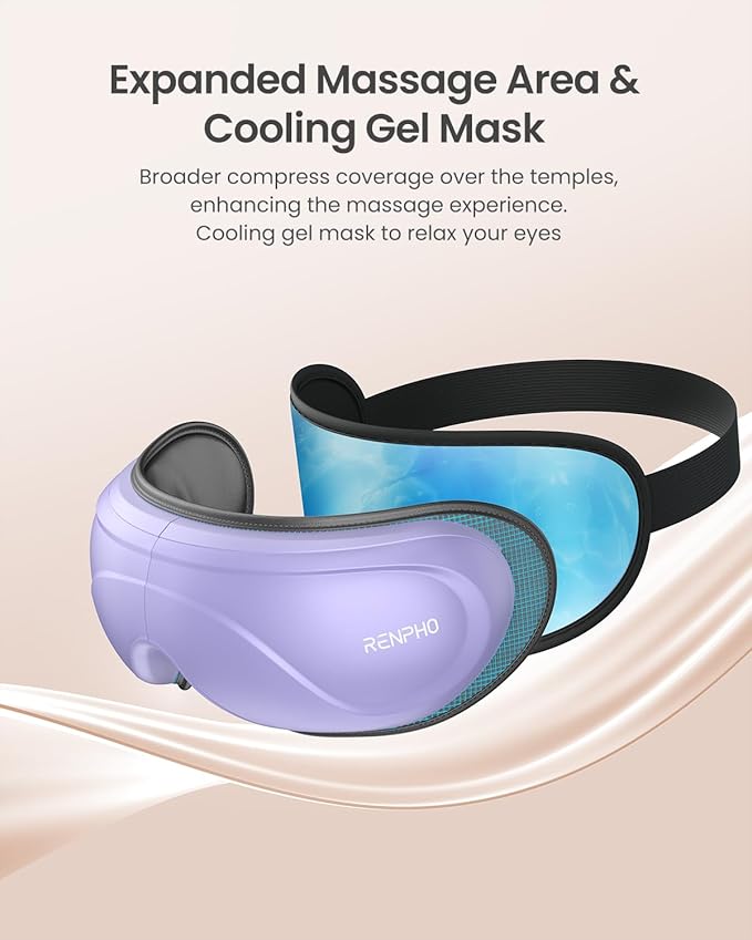 - Soothing Heating & Cooling Eye Therapy: Experience customizable comfort with 2 adjustable heat settings (104°F-113°F/40°C-45°C) to effectively relieve puffiness, dry eyes, and tension. For cooling relief, simply chill the removable gel mask (35-60 minutes in freezer) and enjoy instant refreshment that reduces eye strain and fatigue. The ergonomic design features extended massage pads and an adjustable headband for a perfect, personalized fit that accommodates most users.