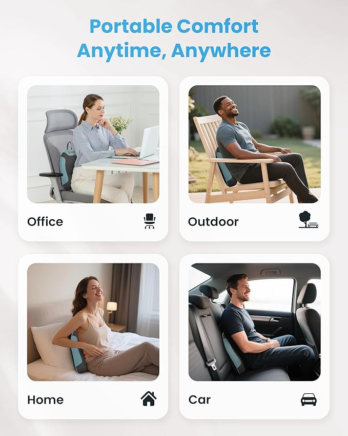- 【Wireless Freedom, Full Relaxation】 – Enjoy cordless comfort wherever life takes you. This COMFIER cordless back massager with heat is lightweight (only 3.1 lbs) and fits easily in your carry-on or drawer. Whether at home, in the office, or traveling as a passenger, this wireless lower back massager provides relaxing relief without tangled cords or outlets. The built-in rechargeable battery supports up to 1.5 hours of cordless use, making it your perfect daily relaxation companion.