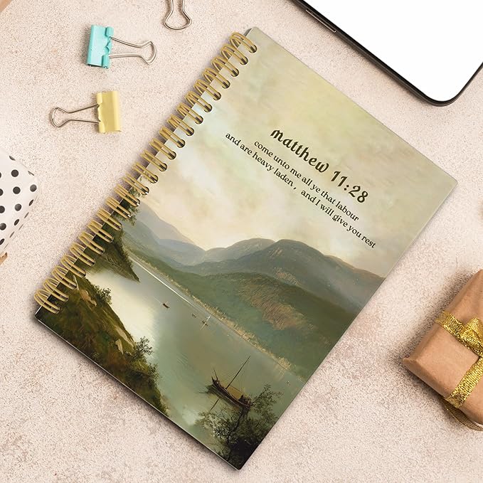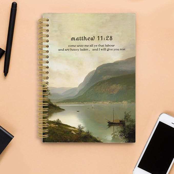 Mountain Lakeside Christian Spiral Notebook, Matthew 11:28 Bible Verse Journal, Religious Notebooks for School Work, Christian Office Supplies, Bible Gifts for Women Men, 5.5x8.3 Inch