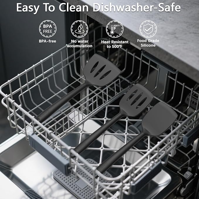 - [Easy to Clean & Dishwasher Safe]: The non-stick silicone surface makes cleanup a breeze, and all utensils are dishwasher-safe for added convenience. With top hanging holes and the included storage holder, organizing and storing your utensils is easier than ever