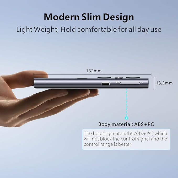 - Mouse Cursor Control -The presenter's mouse functions include mouse left click, double click and mouse right click. The housing material is ABS and PC mixture which is friendly for signal transmission. It's modern slim design, light weight and comfortable for all day use.