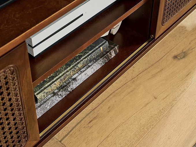 - 【Flexible and Stylish Storage】This media console table is a masterpiece of design.It has open shelves in the middle and on both sides for storage,allowing you to easily display your items.The sliding rattan cabinet doors on either side add a touch of elegance and charm.This walnut mid century modern TV cabinet not only provides ample storage but also adds a touch of sophistication to your home decor