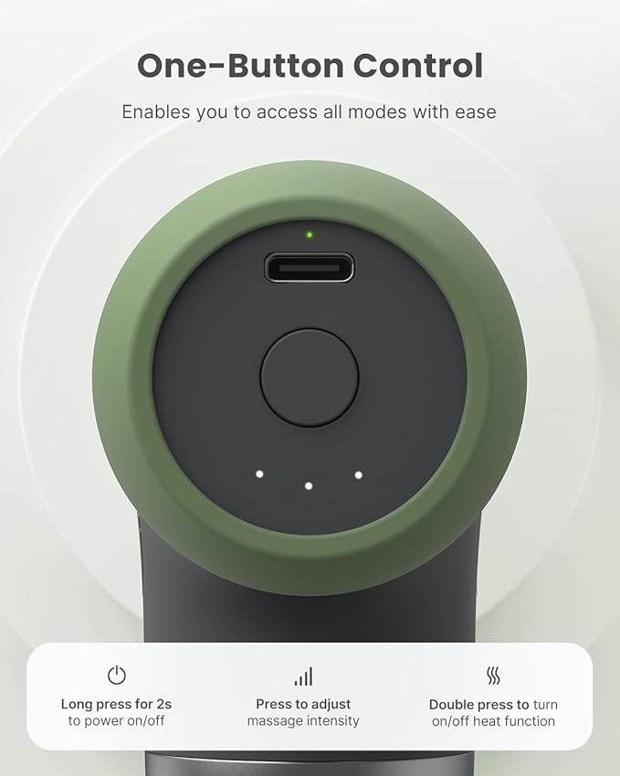 - Effective Heated Massage: Equipped with heat-conductive steel head, the deep tissue massage gun warms up to 46℃/114°F in just 1 minute, effectively reducing muscle tension and soreness.Note:Double press the Power button to enable the heating function. The light is red when the heating function is activated. Do not use the silicone massage head when using the heating function.