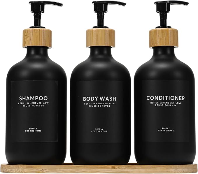 - DECORATIVE SHOWER DISPENSER SET OF 3: A stylish & luxurious way to organize your bathroom! Create a comfortable, relaxing atmosphere with exquisite set including shampoo, conditioner & body wash dispensers Bottles (each with a large capacity of 16.9 oz), Shower Lables and a Bamboo Tray