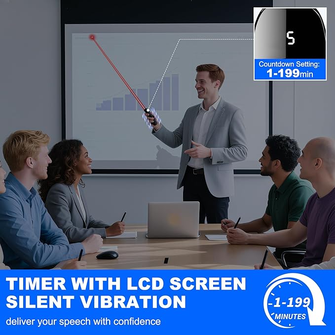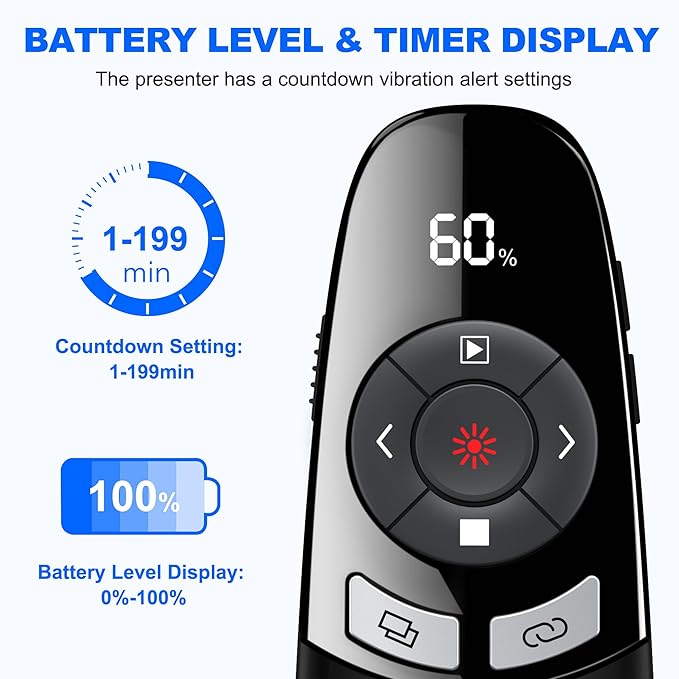 - 【Precise Control of Presentation Time】: This presentation remote clicker is equipped with a countdown function, allowing you to set a timer for 1-199 minutes. It will silently vibrate to alert you when there are 5 minutes and 0 minutes remaining. The built-in LED screen clearly displays the remaining time, enabling you to handle every presentation with confidence and showcase your stage presence
