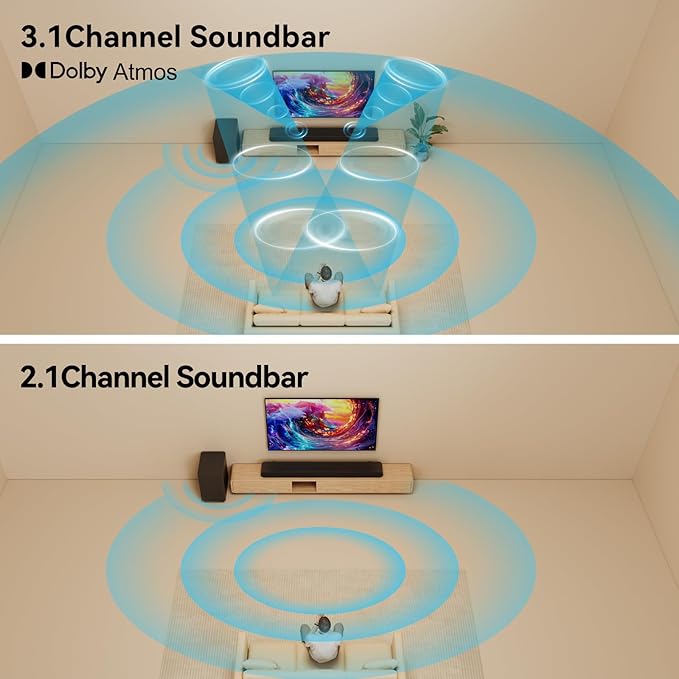 - 3D Dolby Atmos Soundbar for TV:True 3.1CH audio with With 3 front channels + wired subwoofer. Feel overhead rain and 360° flight effects for immersive movies/games.