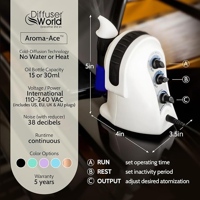 - LOW MAINTENANCE DESIGN WITH LONG RUNTIME: Our waterless essential oils diffuser requires minimal upkeep while offering continuous scent diffusion for up to all-night atomization. Designed for use as a room diffuser, home scent diffuser, or home diffuser oil machine, it combines quiet operation with steady performance. This waterless scent diffuser is an excellent option for bedrooms, offices, or large rooms, delivering soothing, lasting aromas without the need for frequent refills.