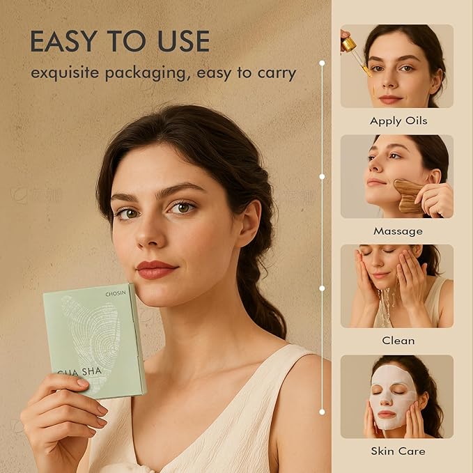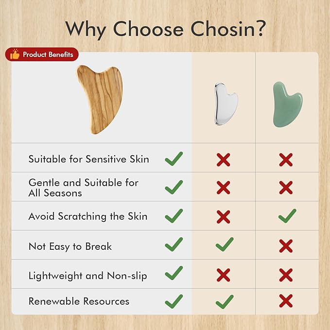 - Gentle on Sensitive Skin: Made of 100% olive wood, the surface is hand-polished to ensure smoothness and no burrs. Unlike jade and stainless steel, CHOSIN gua sha is a natural facial massager tool that is gentle and non-irritating, allowing you to experience a more comfortable face massage journey, and is ideal for sensitive skin.