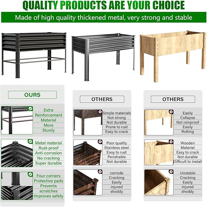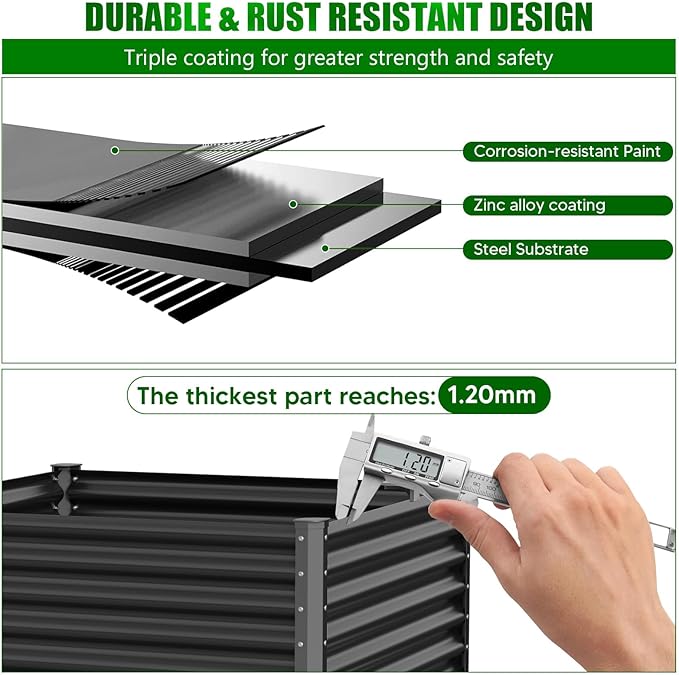 - 【Premium Heavy-Duty Raised Garden Bed】– Designed for gardeners who demand durability and functionality, our raised garden bed can hold up to 58 gallons of soil, providing ample space for plants to thrive. Constructed from reinforced heavy-duty galvanized steel, it is twice as heavy as standard garden beds, ensuring superior strength and longevity. Built to withstand extreme weather conditions, it won’t warp, crack, or rust over time.