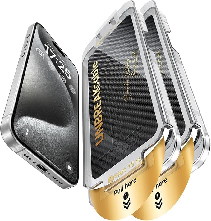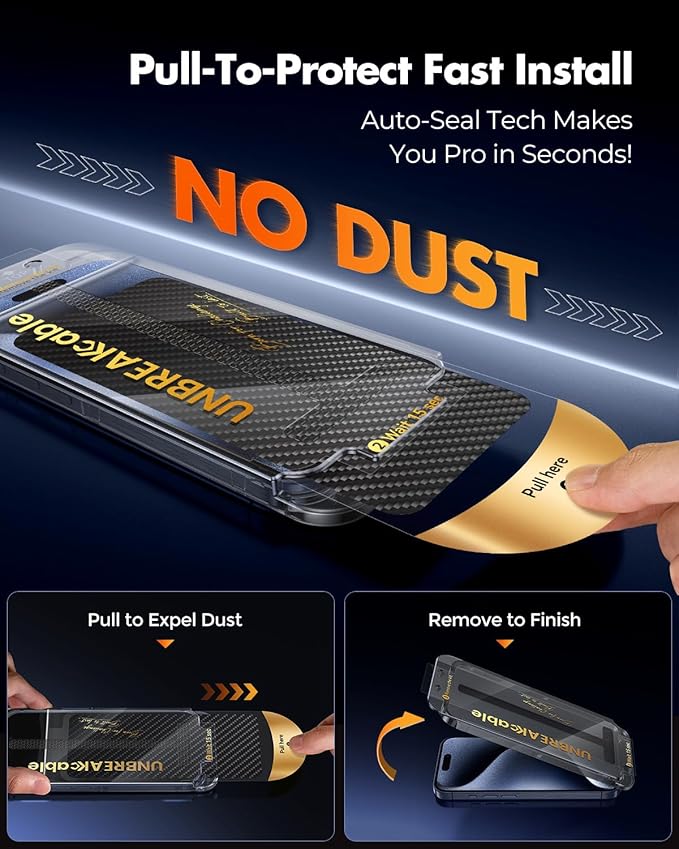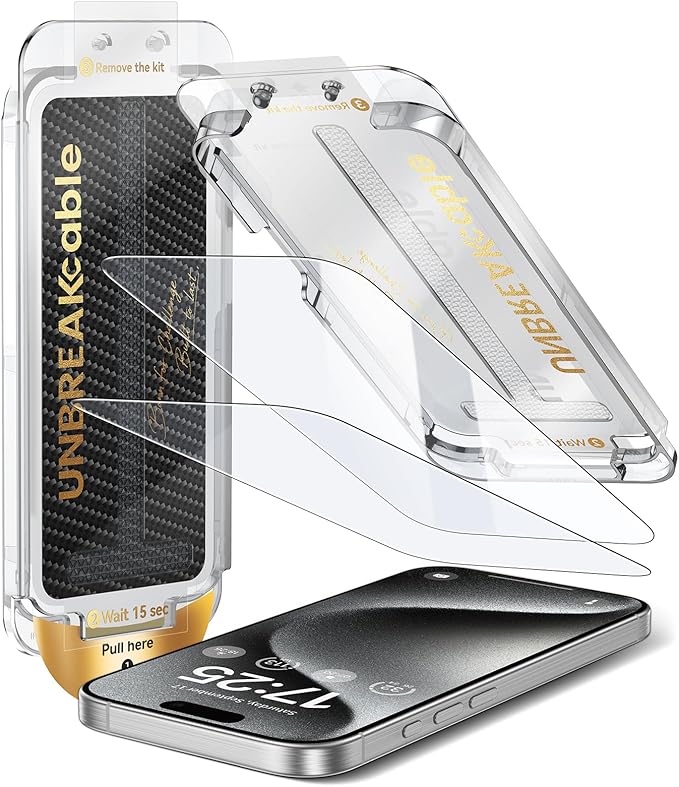 UNBREAKcable Screen Protector for iPhone 15 Pro, Pull-To-Protect Easy Installation, Auto Dust-Elimination, 9H+ Military-Grade Tempered Glass, Bubble-Free, Case Friendly, HD Clear, 6.1 Inch, 2 Pack