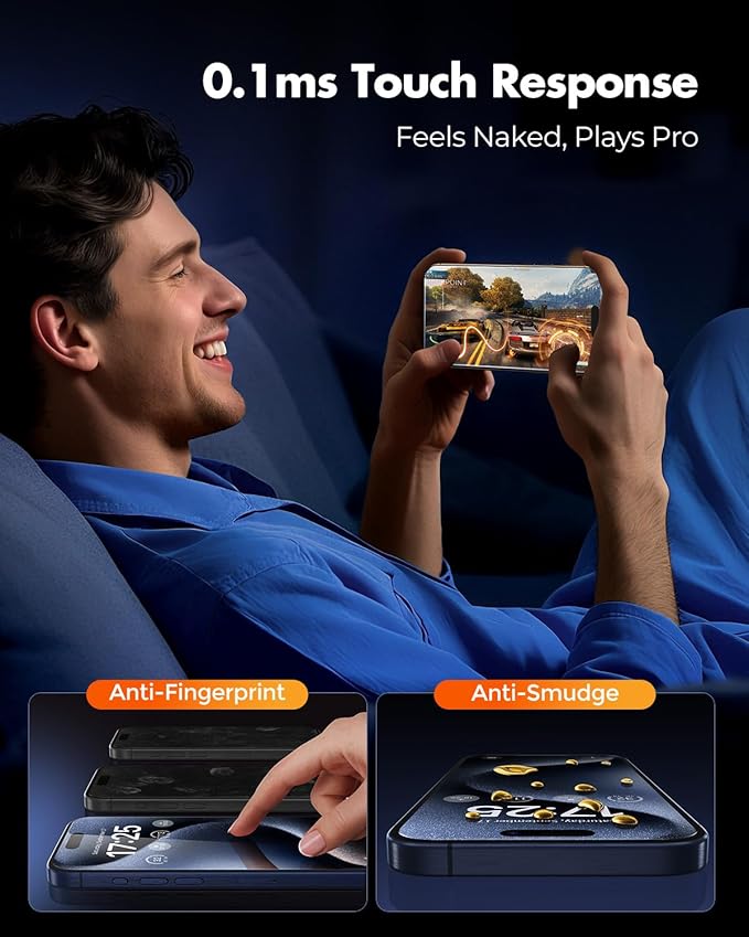 - Anti-fingerprint & smudge-resistant: A nano-grade oleophobic coating repels fingerprints, sweat, and smudges. Your iPhone screen stays crystal clear and easy to wipe clean—even after long hours of use or gaming.