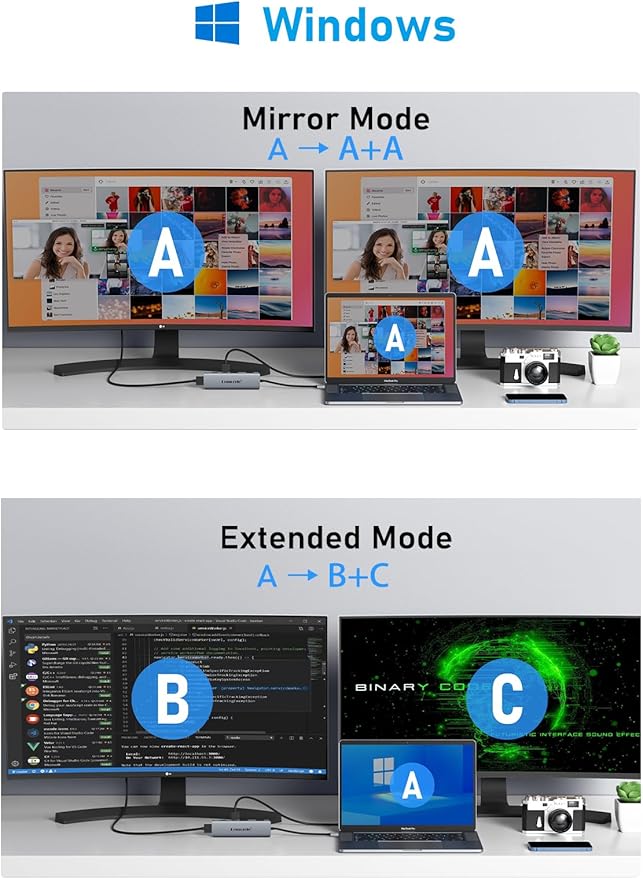 - 【Docking Station 4K Display Adapter:】The Laptop Docking Station with 2 video output ports,allowing you to easily extend your display to any HDMI-compatible TV, monitor, or laptop. A single HDMI port supports resolutions of up to 4K@30Hz, while dual-display mode supports resolutions of up to 1080p@60Hz. On Windows systems, both MST (Extended Mode) and SST (Mirror Mode) are supported.