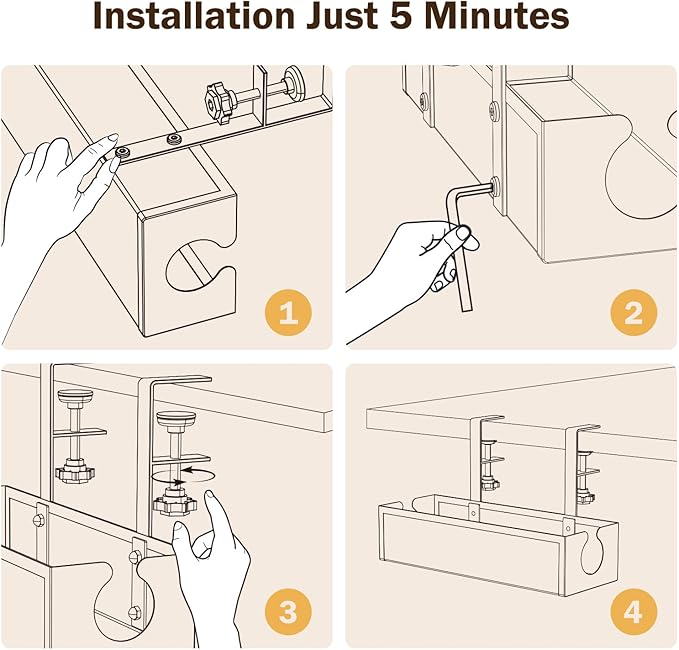 - 【No-Tools, No-Damage Magic】Your desk deserves better than holes and sticky residue! Our cable management under desk system uses a revolutionary clamp-on design that requires no drilling, no glue, and leaves zero marks. The soft silicone pads protect wood, glass, marble, and metal surfaces while keeping your cord management under desk secure. Finally, a solution that respects your furniture